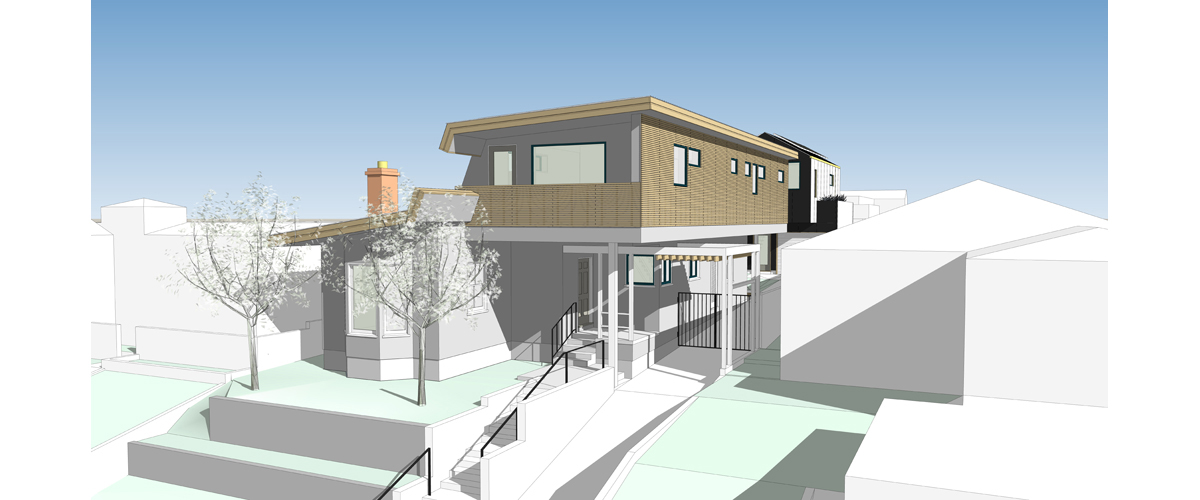 The house's exterior is clad in hand-troweled-smooth cement plaster at the first floor, and thin ceder wood planks in a rainscreen for the second floor. The Accessory Dwelling Unit (ADU), as yet unrealized, is clad in open joint resin panels: black for the north and south elevations, white for the east and west.