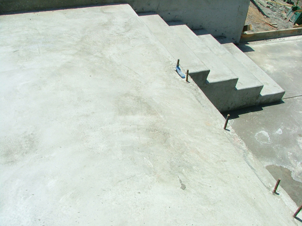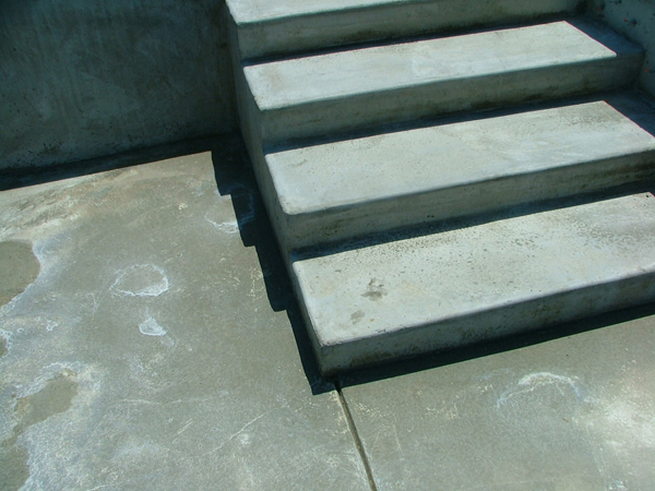 The living room steps still a bit green from the pour, and a bit rougher than the Owner's and I were hoping. Arguably the most important part of placing concrete is the final touch; whatever is done then is visible (unless the finish is ground or covered). Note that the control joint is huge, roughly half an inch. At this size it is a high heel magnet so we will have to fill it in with an epoxy grout. The joint is also placed an inch in from the edge of the stair not at the edge as it was supposed to be.