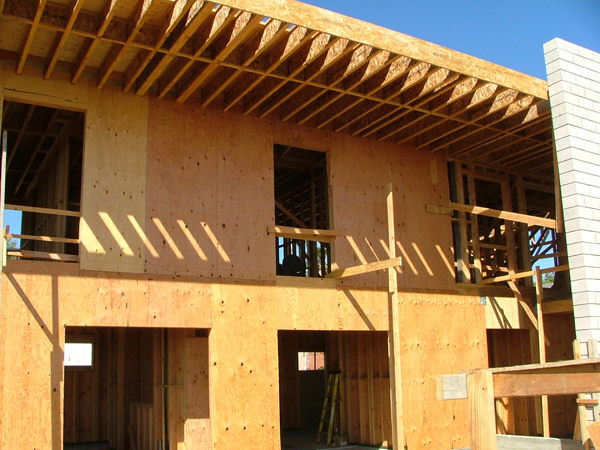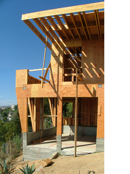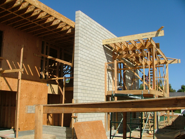 The center of the house. The cantilevered roof is now trimmed to its proper length and capped with a 'rim' board. Note the shade provided in this case at 4:30 in the afternoon, early August.