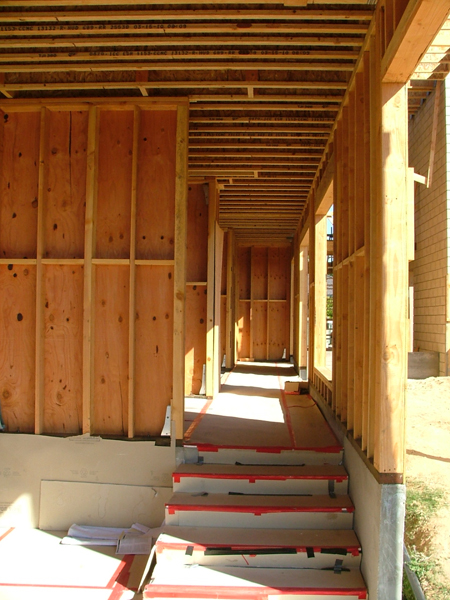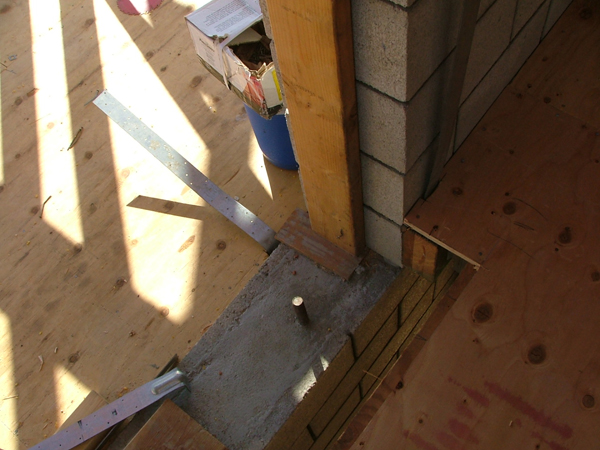 A view from the first floor of the entry vestibule, looking up at the CMU wall opening from the landing into the office. The floor framing is headed out so that the steps into the office can happen coincident with the inside and outside faces of the CMU wall.