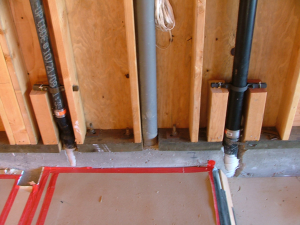 Drain lines, left and right, and power conduit in the center. Note how the drain lines bust out the inside face of the stem wall; although it may not appear this way, this is an acceptable sitution. The key location for the maximum thickness for the concrete is at the exterior face (where in this case there is something close to 1 1/2" of coverage).