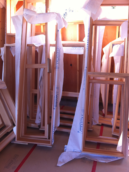 Custom window frames arrive on site - the white paper is the waterproofing flashing.