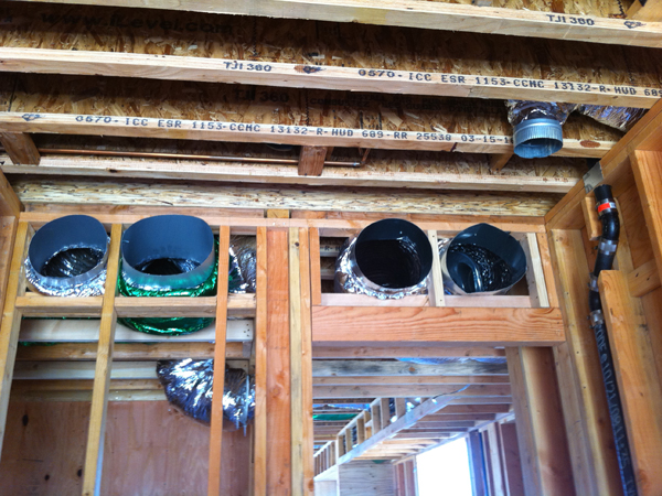 4 large supply ducts branching off from the garage, ready for the HVAC unit.