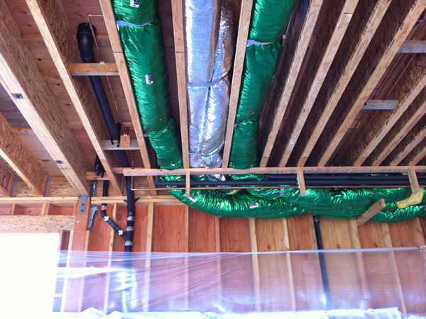 Heavy traffic between the floor joists! Supply ducts, hot and cold water supply and waste lines ... electrical still to come!