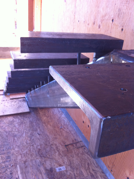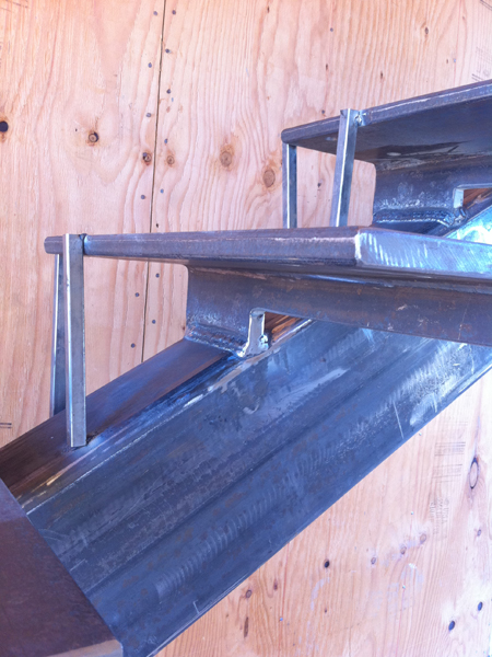 A detail view of the main beam and individual tread supports - the thin metal tubes are temporary, there to provide a jig for the welder to work to.